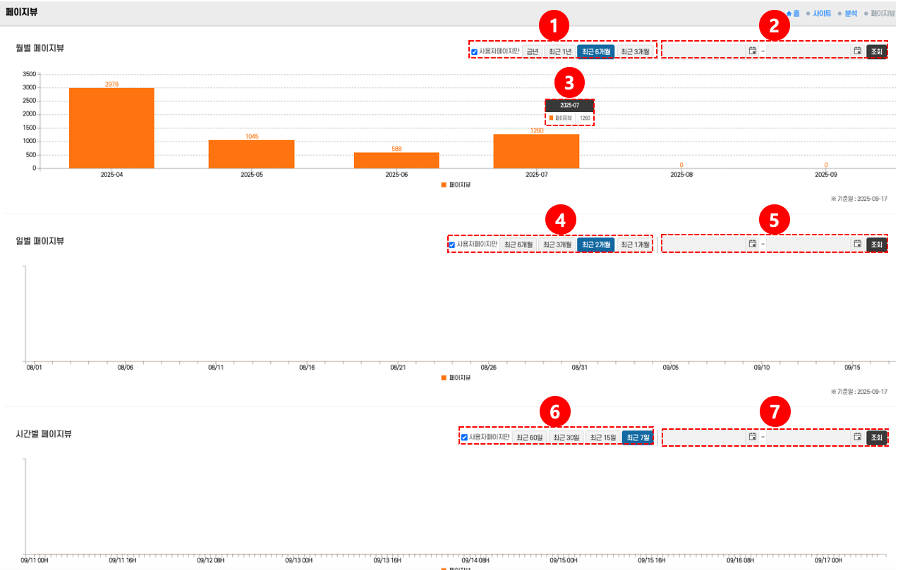 • 시간별 페이지뷰 확인: 하단의 기간 선택(⑥) 또는 기간 설정(⑦) 기능으로 기간을 설정하여 특정 시간대의 페이지뷰를 확인한다.