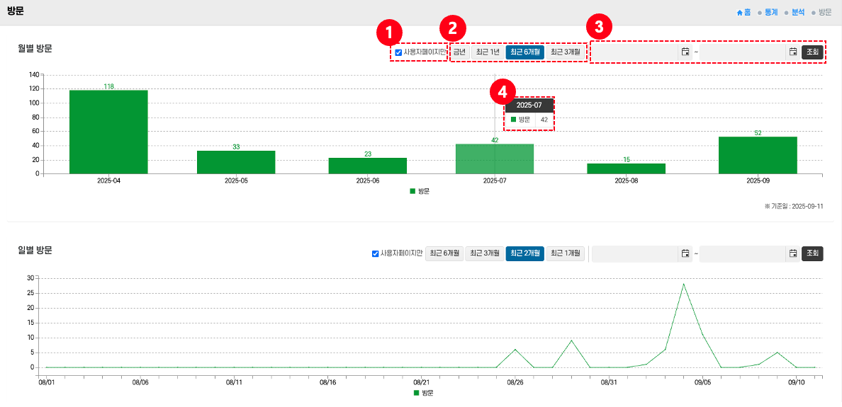 • 기간 설정: 시작월·종료월 입력 후 조회 버튼 ③ 클릭 → 선택 기간의 방문 수 확인이 가능하다.