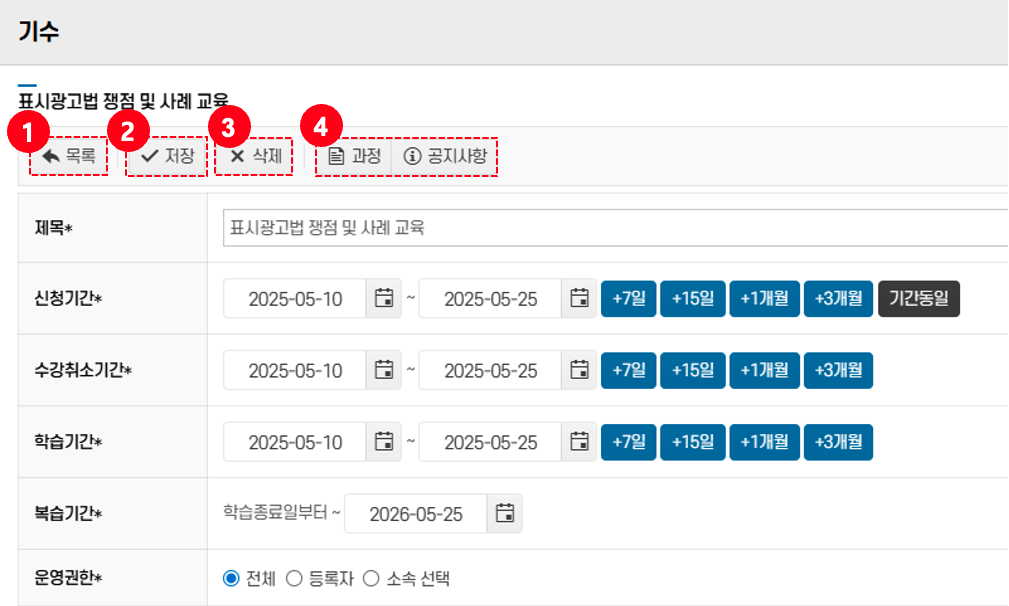 - 저장: 기수 제목, 신청·취소·학습 기간, 운영권한 등을 입력/수정 후 저장 버튼② 클릭 → 변경 내용이 반영된다.