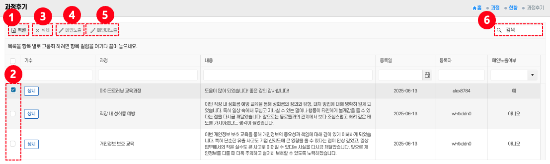 - 현재 화면에 표시된 과정후기 목록을 엑셀 파일로 내려받는다.