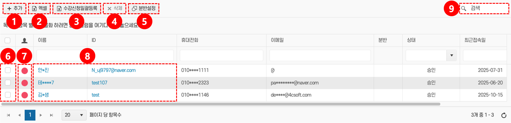 - 체크박스: 여러 학습자를 동시에 선택할 때 체크박스⑥ 를 클릭한다.