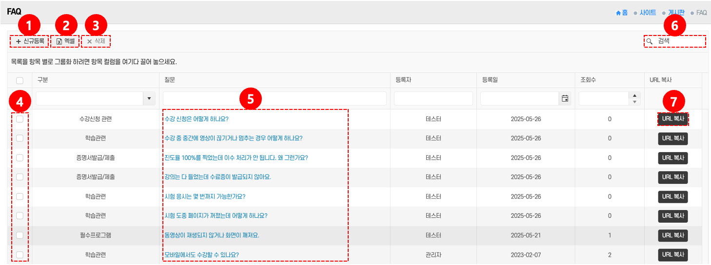URL 복사: 우측의 URL 복사 버튼 ⑦을 클릭 → FAQ 주소를 클립보드에 복사한다.
