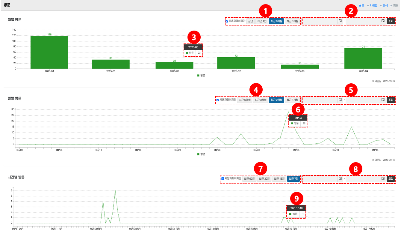 시간별 방문 확인: 하단의 기간 선택(⑦) 또는 기간 설정(⑧) 기능으로 기간을 설정하고, 특정 시간대의 **방문 수(⑨)**를 확인한다.