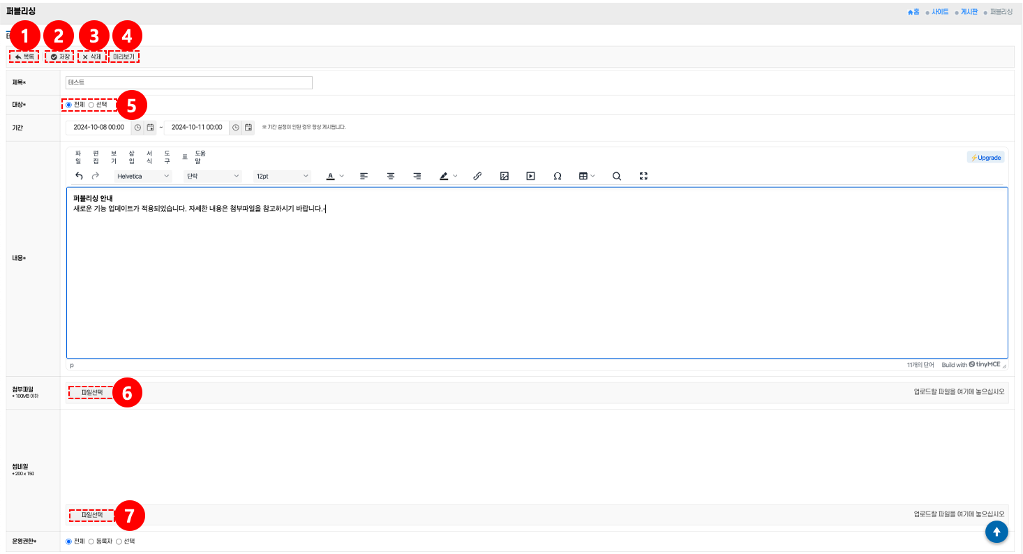 - 퍼블리싱 저장: 제목/내용 입력 후 저장 버튼 ② 클릭 → 게시글을 등록한다.