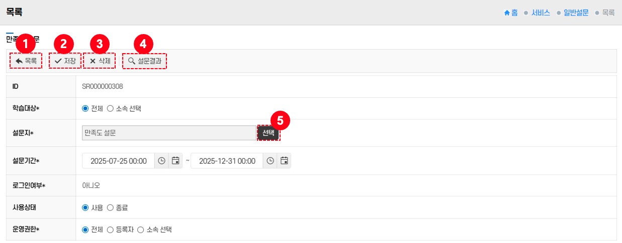 - 목록: 상단의 목록 버튼① 클릭 → 설문 관리 화면 목록으로 이동한다.