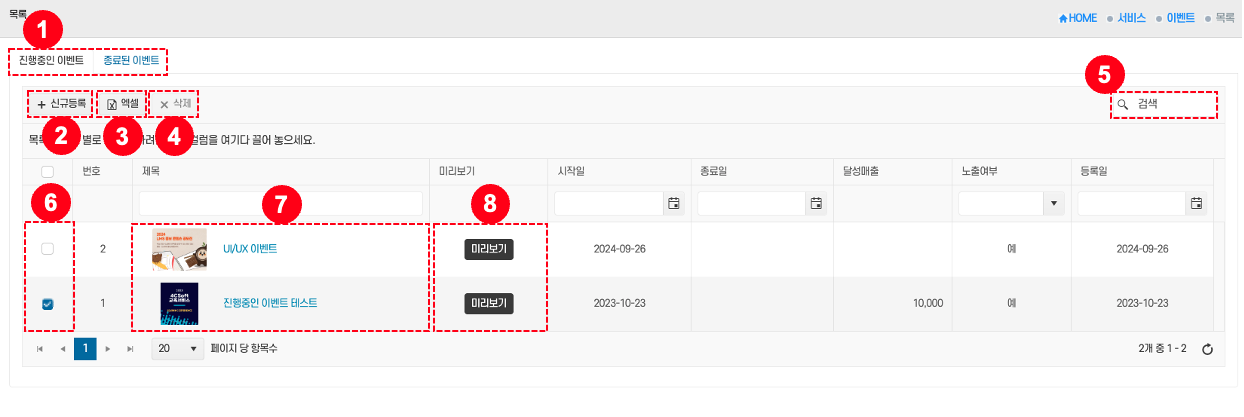 - 검색: 상단의 검색창 ⑤에 제목, 기간 등을 입력 → 검색 버튼 클릭 → 조건에 맞는 이벤트만 표시된다.