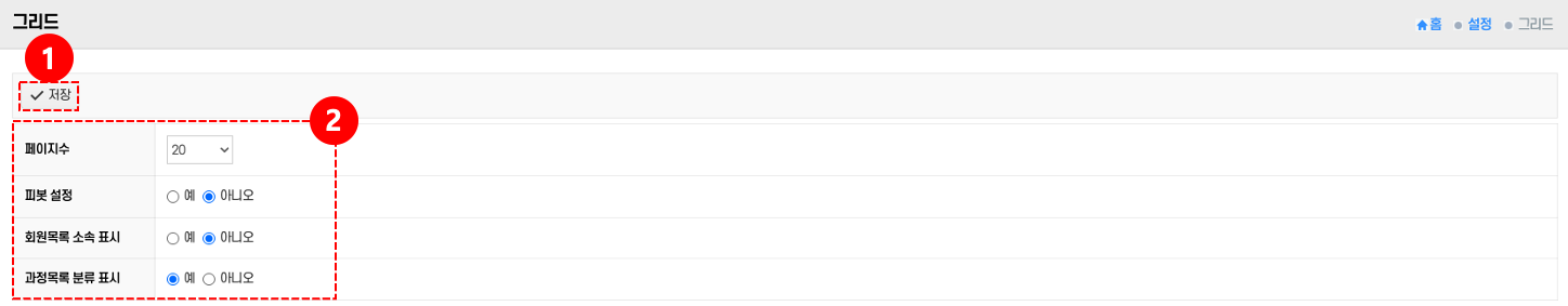 - 그리드 설정: 화면의 그리드 설정 영역 ②에서 페이지 수, 피벗 설정, 회원목록 소속 표시, 과정목록 분류 표시 여부를 원하는 값으로 선택한다.