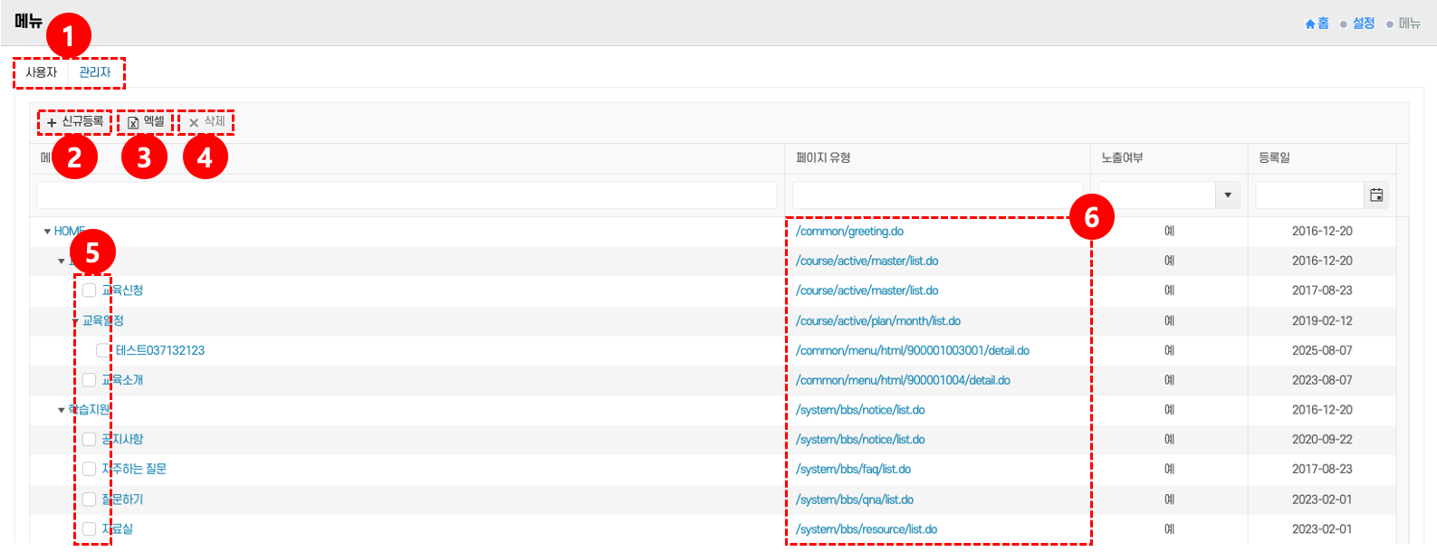 - 신규 등록: 새 메뉴를 추가하려면 신규등록 버튼 ② 클릭 → 메뉴명, URL, 노출 여부 등을 입력 후 저장한다.