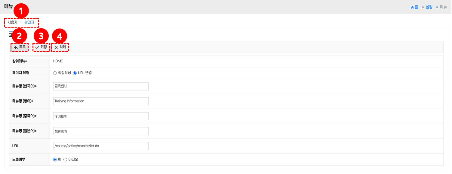 - 저장: 메뉴명, URL, 노출 여부 등을 입력한 뒤 저장 버튼 ③ 클릭 → 수정 사항이 반영된다.