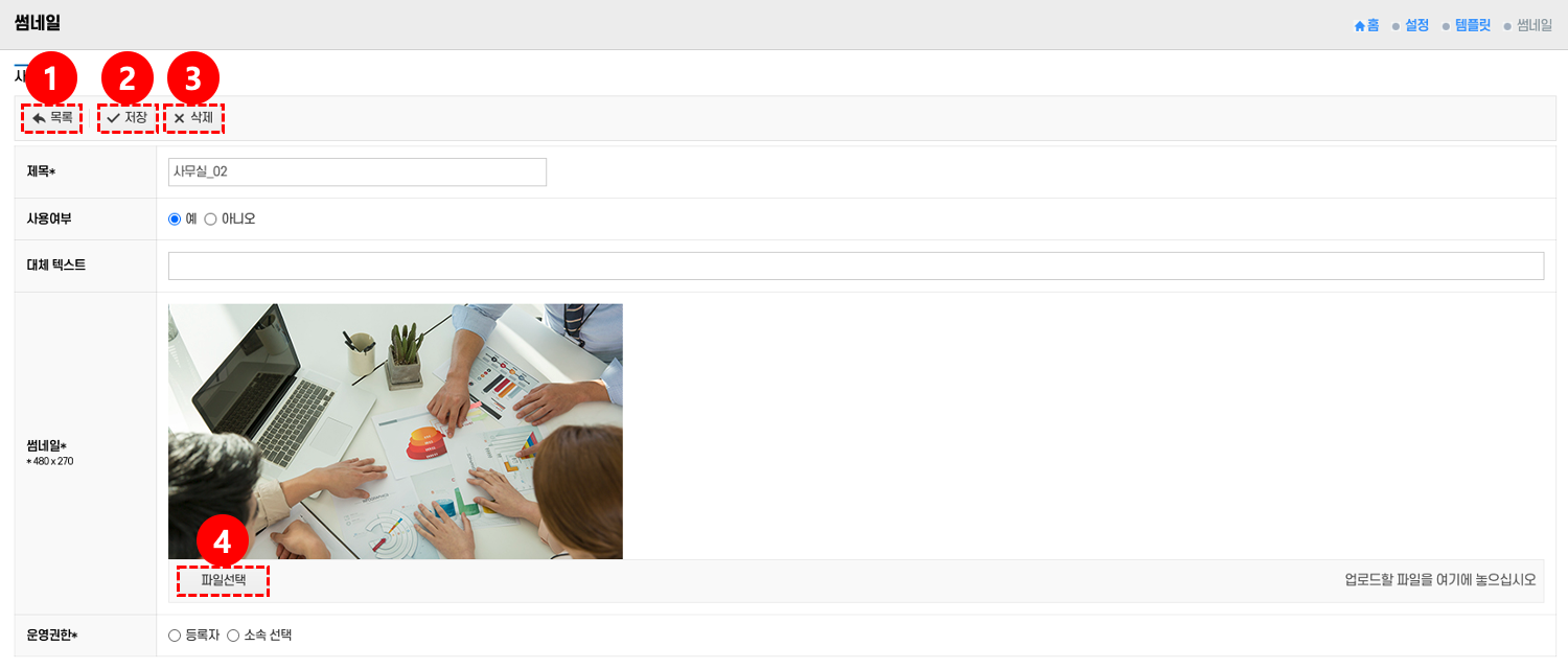 - 저장: 썸네일 정보를 입력한 후 저장 버튼 ② 클릭 → 입력된 내용이 저장된다.