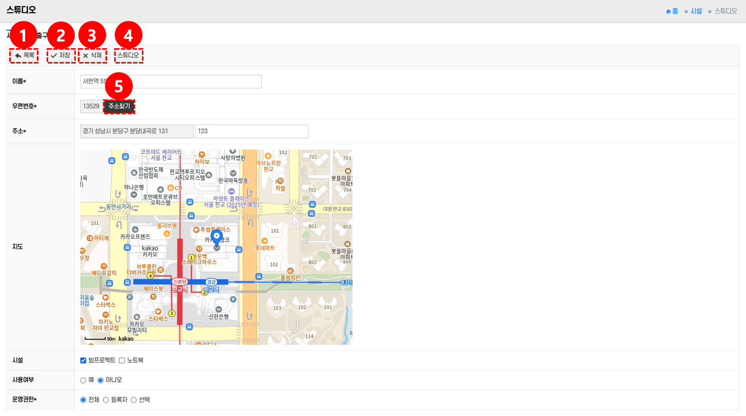 - 저장: 상단의 저장 버튼 ②을 클릭 → 입력한 스튜디오 정보 저장한다.
