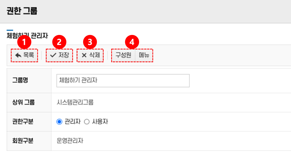 • 저장: 그룹명과 권한구분을 입력 후 저장 버튼 ②를 클릭 → 입력된 내용이 저장된다.