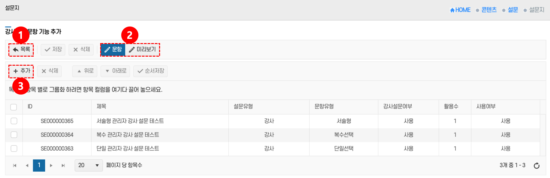 - 문항 관리: 설문 문항을 편집하려면 문항 버튼 ②을 클릭한다.