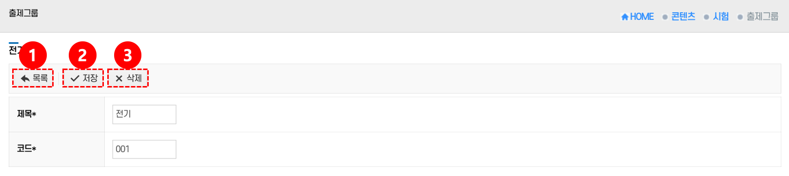 - 저장: 제목, 코드 등 필수 항목을 입력한 뒤 저장 버튼 ②을 클릭하면 출제그룹이 등록된다.