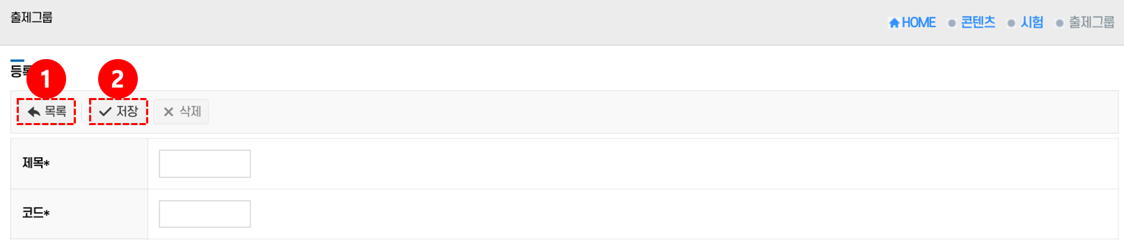- 저장: 제목, 코드 등 필수 항목을 입력한 뒤 저장 버튼 ②을 클릭하면 출제그룹이 등록된다.