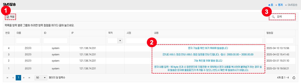 - 엑셀 다운로드: 상단의 엑셀 버튼 ① 클릭 → 현재 표시된 SMS 발송 내역이 엑셀 파일로 저장된다.