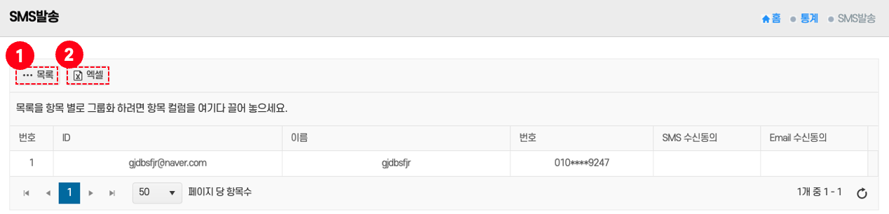 - 목록: 상단의 목록 버튼①** 클릭 → SMS 발송 목록 화면으로 돌아간다.
