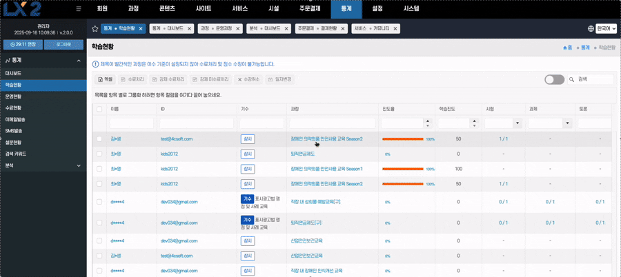 - 화면에서 학습자별 진도율, 학습 횟수, 시험 및 과제 참여 여부를 확인할 수 있다.