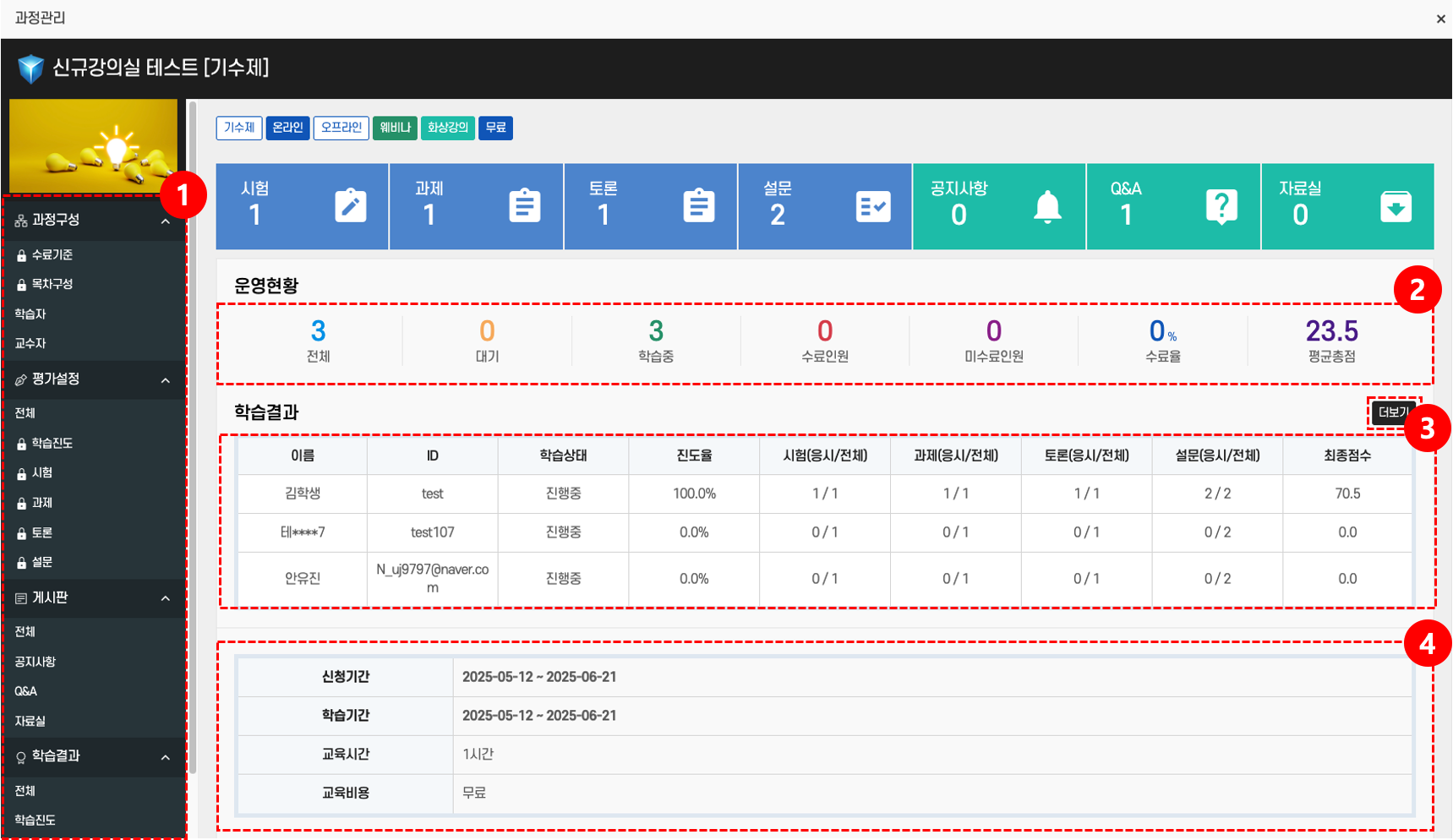 - 학습결과: 학습자의 진도율과 시험·과제 응시 여부를 검토하며, 필요 시 더보기 버튼 ③을 클릭해 상세 내용을 조회한다.